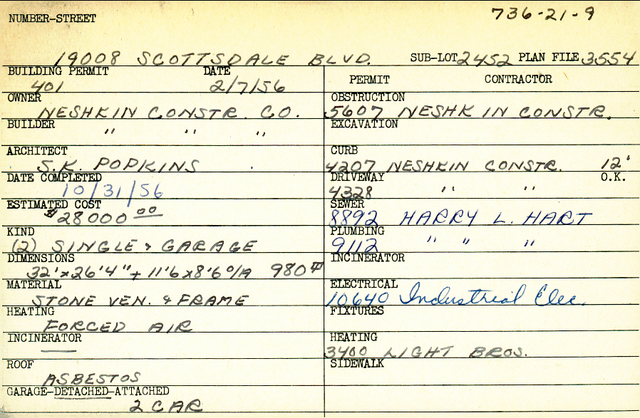 19008 Scottsdale Boulevard Shaker Heights, OH 44122 PARCEL ID: 736-21-009 Building Permit Date: 02-07-1956 Plan File Number: 3554 Microfilm Roll: Roll#52 Neighborhood: Sussex Owner: Neshkin Construction Company Builder: Neshkin Construction Company Architect: Popkins, S. K. Estimated Cost: 28000 Date Completed: 10-31-1956 Kind: Single Dwelling and Garage (2) Material: Stone Veneer and Frame Heating: Forced Air Roof: Asbestos Garage: detached 2 car |