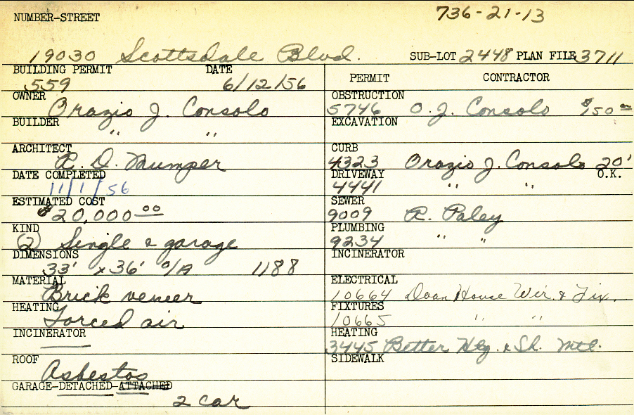 19030 Scottsdale Boulevard Shaker Heights, OH 44122 PARCEL ID: 736-21-013 Building Permit Date: 06-12-1956 Plan File Number: 3711 Microfilm Roll: Roll#51 Neighborhood: Sussex Owner: Consolo, Orazio J. Builder: Consolo, Orazio J. Architect: Mumper, R. D. Estimated Cost: 20000 Date Completed: 11-01-1956 Kind: Single Dwelling and Garage (2) Material: Brick Veneer Heating: Forced Air Roof: Asbestos Garage: detached 2 car |