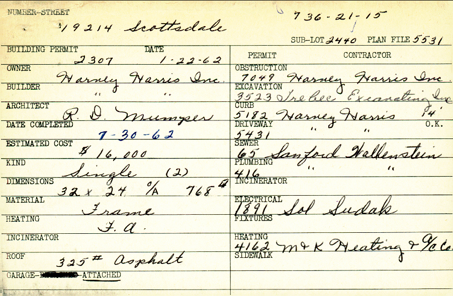 19214 Scottsdale Boulevard Shaker Heights, OH 44122 PARCEL ID: 736-21-015 Building Permit Date: 01-22-1962 Plan File Number: 5531, 9132 Microfilm Roll: Roll#102 Neighborhood: Sussex Owner: Harvey Harris Inc. Builder: Harvey Harris Inc. Architect: Mumper, R. D. Estimated Cost: 16000 Date Completed: 07-30-1962 Kind: Single, Single Residence or Dwelling (2) Material: Frame Heating: Forced Air Roof: 325# Asphalt Garage: attached |