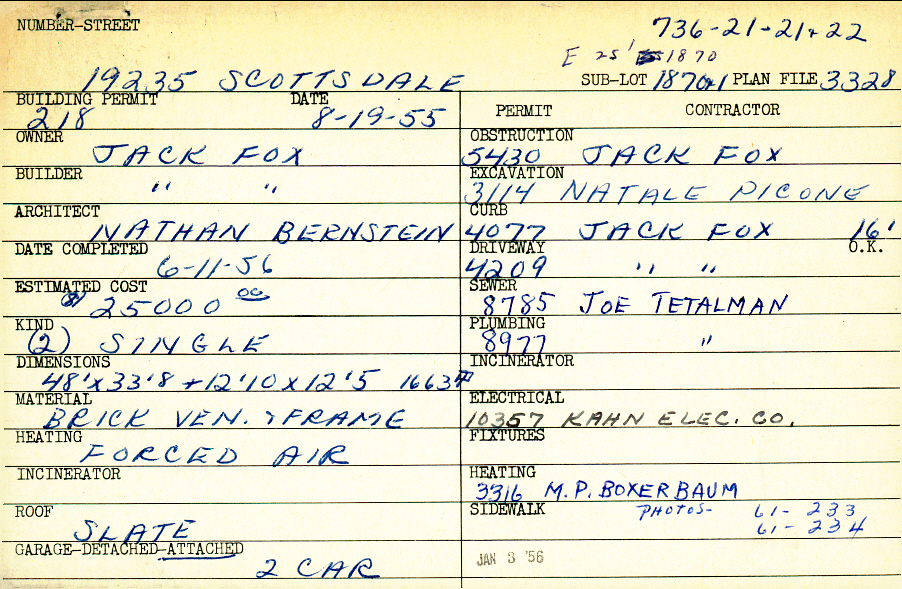 19235 Scottsdale Boulevard Shaker Heights, OH 44122 PARCEL ID: 736-21-021 Building Permit Date: 08-19-1955 Plan File Number: 3328 Microfilm Roll: Roll#48 Neighborhood: Sussex Owner: Fox, Jack Builder: Fox, Jack Architect: Bernstein, Nathan Estimated Cost: 25000 Date Completed: 06-11-1956 Kind: Single, Single Residence or Dwelling (2) Material: Brick Veneer and Frame Heating: Forced Air Roof: Slate Garage: attached 2 car |