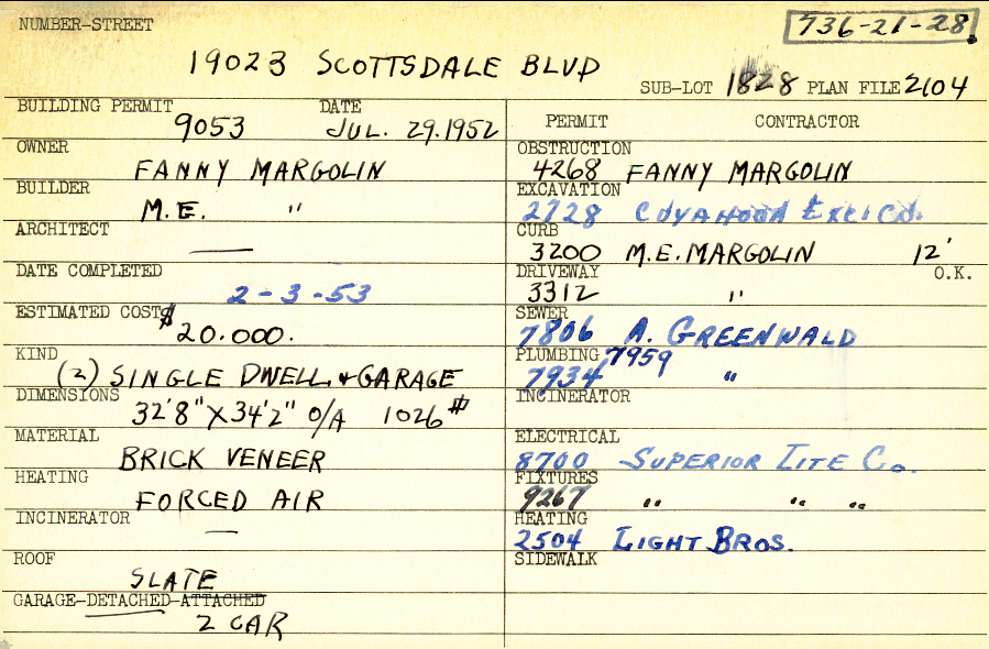 19023 Scottsdale Boulevard Shaker Heights, OH 44122 PARCEL ID: 736-21-028 Building Permit Date: 07-29-1952 Plan File Number: 2104 Microfilm Roll: Roll#32 Neighborhood: Sussex Owner: Margolin, Fanny Builder: Margolin, M. E. Estimated Cost: 20000 Date Completed: 02-03-1953 Kind: Single Dwelling and Garage (2) Material: Brick Veneer Heating: Forced Air Roof: Slate Garage: detached 2 car |