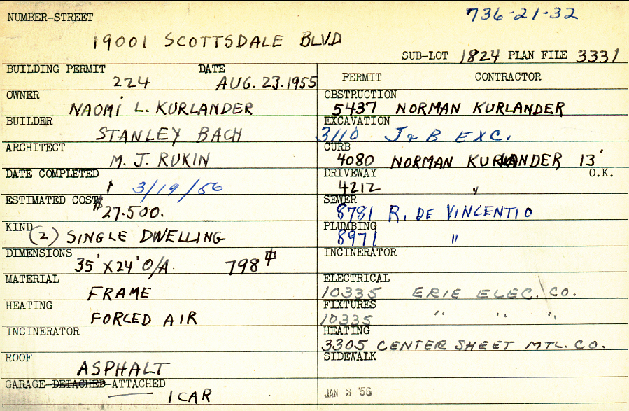 19001 Scottsdale Boulevard Shaker Heights, OH 44122 PARCEL ID: 736-21-032 Building Permit Date: 08-23-1955 Plan File Number: 3331 Microfilm Roll: Roll#48 Neighborhood: Sussex Owner: Kurlander, Naomi L. Builder: Bach, Stanley Architect: Rukin, M. J. Estimated Cost: 27500 Date Completed: 03-19-1956 Kind: Single, Single Residence or Dwelling (2) Material: Frame Heating: Forced Air Roof: Asphalt Garage: attached |