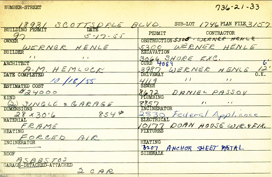 18931 Scottsdale Boulevard Shaker Heights, OH 44122 PARCEL ID: 736-21-033 Building Permit Date: 05-17-1955 Plan File Number: 3157 Microfilm Roll: Roll#44 Neighborhood: Sussex Owner: Henle, Werner Builder: Henle, Werner Architect: Hemlock, A. M. Estimated Cost: 24000 Date Completed: 10-18-1955 Kind: Single Dwelling and Garage (2) Material: Frame Heating: Forced Air Roof: Asbestos Garage: detached 2 car |