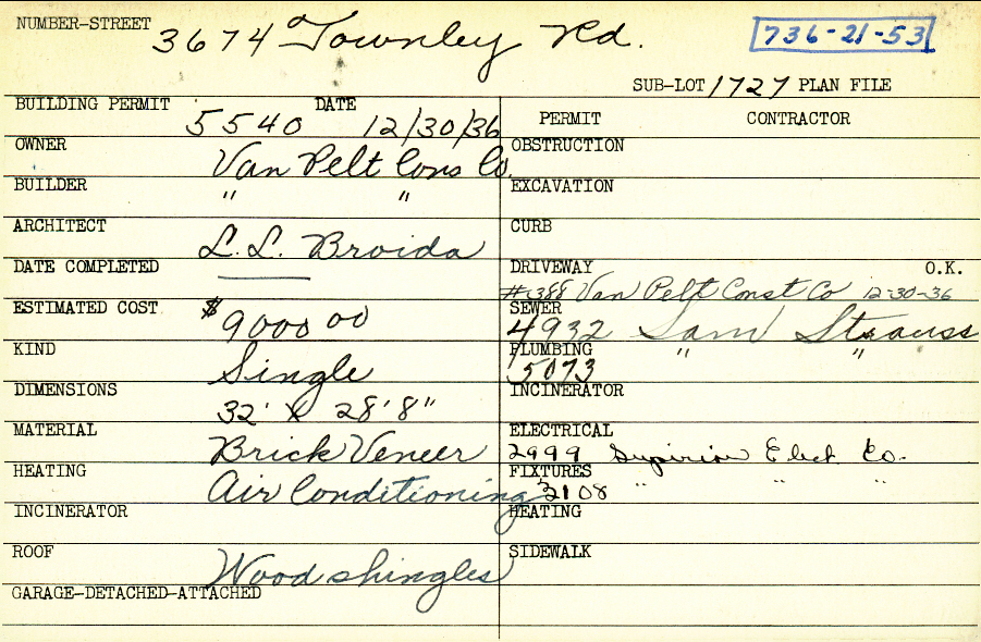 3674 Townley Road Shaker Heights, OH 44122 PARCEL ID: 736-21-053 Building Permit Date: 12-30-1936 Plan File Number: 2778, 9664 Microfilm Roll: Roll #38, Roll#104 Neighborhood: Sussex Owner: Van Pelt Construction Company Builder: Van Pelt Construction Company Architect: Broida, L. L. Estimated Cost: 9000 Kind: Single, Single Residence or Dwelling Material: Brick Veneer Heating: Air Conditioned Roof: Wood Shingle |