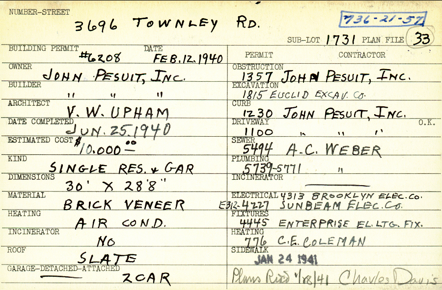 3696 Townley Road Shaker Heights, OH 44122 PARCEL ID: 736-21-057 Building Permit Date: 02-12-1940 Neighborhood: Sussex Owner: John Pesuit Inc. Builder: John Pesuit Inc. Architect: Upham, V. W. Estimated Cost: 10000 Date Completed: 06-25-1940 Kind: Single Dwelling and Garage Material: Brick Veneer Heating: Air Conditioned Roof: Slate Garage: detached 2 car Blueprints: no blueprints on microfilm |