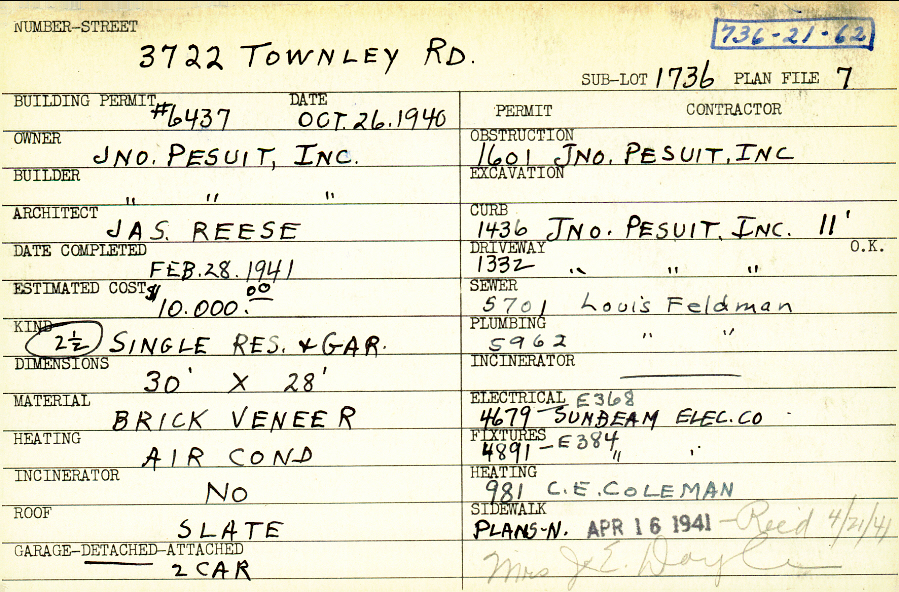 3722 Townley Road Shaker Heights, OH 44122 PARCEL ID: 736-21-062 Building Permit Date: 10-26-1940 Plan File Number: 7 Neighborhood: Sussex Owner: John Pesuit Inc. Builder: John Pesuit Inc. Architect: Reese, James A. Estimated Cost: 10000 Date Completed: 02-28-1941 Kind: Single 2-1/2 Material: Brick Veneer Heating: Air Conditioned Roof: Slate Garage: detached 2 car |