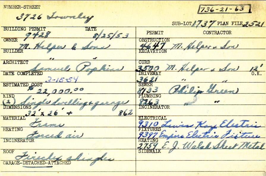 3726 Townley Road Shaker Heights, OH 44122 PARCEL ID: 736-21-063 Building Permit Date: 08-25-1953 Plan File Number: 2521 Neighborhood: Sussex Owner: M. Helper and Sons Builder: M. Helper and Sons Architect: Popkins, Samuel Estimated Cost: 22000 Date Completed: 03-15-1954 Kind: Single Dwelling and Garage (2) Material: Frame Heating: Forced Air Roof: Shingles Garage: detached |