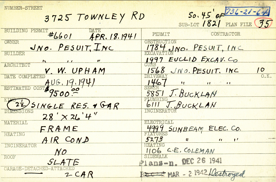 3725 Townley Road Shaker Heights, OH 44122 PARCEL ID: 736-21-064 Building Permit Date: 04-18-1941 Neighborhood: Sussex Owner: John Pesuit, Inc. Builder: John Pesuit, Inc. Architect: Upham, V. W. Estimated Cost: 9500 Date Completed: 08-19-1941 Kind: Single 2-1/2 Material: Frame Heating: Air Conditioned Roof: Slate Garage: attached 2 car Card Available: Yes Blueprints: no blueprints on microfilm |