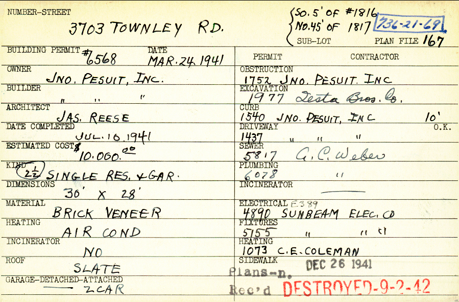 3703 Townley Road Shaker Heights, OH 44122 PARCEL ID: 736-21-069 Building Permit Date: 03-24-1941 Plan File Number: 167 Neighborhood: Sussex Owner: John Pesuit Inc. Builder: John Pesuit Inc. Architect: Reese, James A. Estimated Cost: 10000 Date Completed: 07-10-1941 Kind: Single 2-1/2 Material: Brick Veneer Heating: Air Conditioned Roof: Slate Garage: detached 2 car |