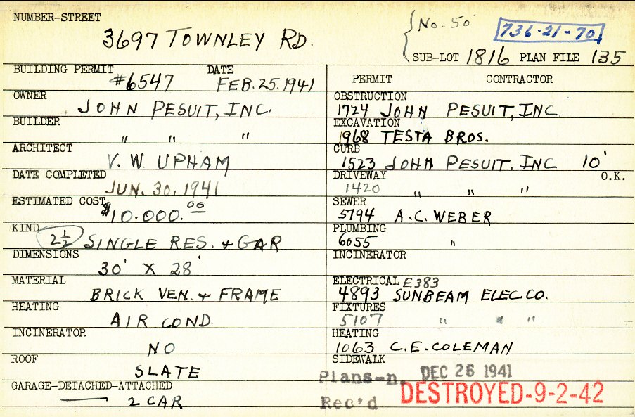3697 Townley Road Shaker Heights, OH 44122 PARCEL ID: 736-21-070 Building Permit Date: 02-25-1941 Plan File Number: 135, 12364 Microfilm Roll: NewRoll#12 Neighborhood: Sussex Owner: John Pesuit Inc. Builder: John Pesuit Inc. Architect: Upham, V. W. Estimated Cost: 10000 Date Completed: 06-30-1941 Kind: Single 2-1/2 Material: Brick Veneer and Frame Heating: Air Conditioned Roof: Slate Garage: detached 2 car |
