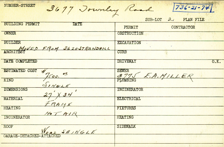3677 Townley Road Shaker Heights, OH 44122 PARCEL ID: 736-21-074 Plan File Number: 6877, 9740 Microfilm Roll: Roll#89, Roll#104 Neighborhood: Sussex Estimated Cost: 7500 Kind: Single, Single Residence or Dwelling Material: Frame Heating: Hot Air Roof: Wood Shingle |