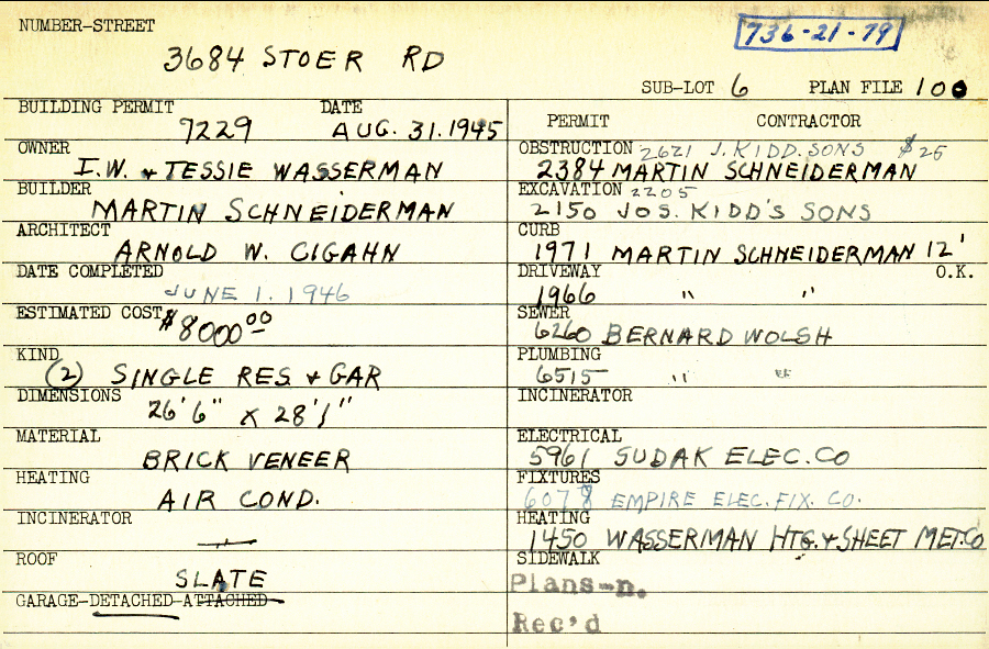 3684 Stoer Road Shaker Heights, OH 44122 PARCEL ID: 736-21-079 Building Permit Date: 08-31-1945 Plan File Number: 100 all scanned Microfilm Roll: Roll001 Neighborhood: Sussex Owner: Wasserman, I. W. and Tessie Builder: Schneiderman, Martin Architect: Cigahn, Arnold W. Estimated Cost: 8000 Date Completed: 06-01-1946 Kind: Single Dwelling and Garage (2) Material: Brick Veneer Heating: Air Conditioned Roof: Slate Garage: detached |
