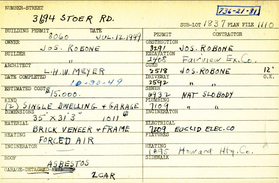 3694 Stoer Road Shaker Heights, OH 44122 PARCEL ID: 736-21-081 Building Permit Date: 07-12-1949 Plan File Number: 1110 all scanned Microfilm Roll: Roll013 Neighborhood: Sussex Owner: Robone, Joseph Builder: Robone, Joseph Architect: Meyer, L. H. W. Estimated Cost: 15000 Date Completed: 10-30-1949 Kind: Single Dwelling and Garage (2) Material: Brick Veneer and Frame Heating: Forced Air Roof: Asbestos Garage: detached 2 car |