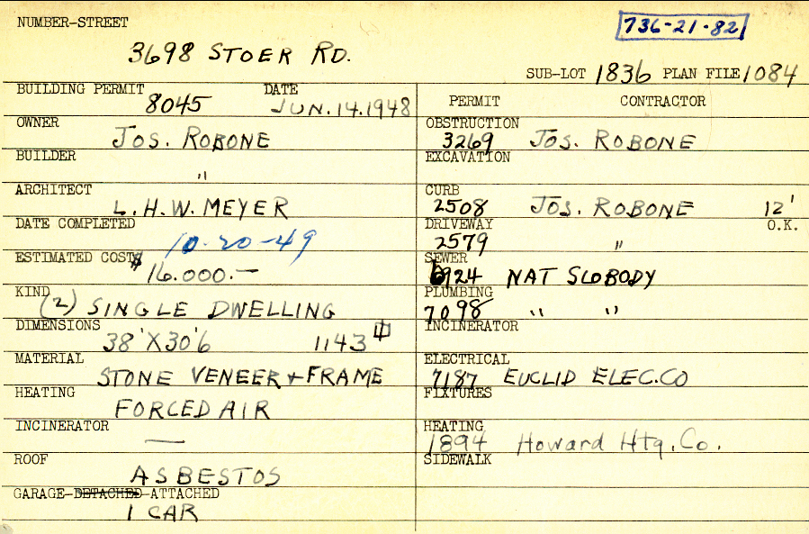 3698 Stoer Road Shaker Heights, OH 44122 PARCEL ID: 736-21-082 Building Permit Date: 06-14-1948 Plan File Number: 1084 all scanned Microfilm Roll: Roll013 Neighborhood: Sussex Owner: Robone, Joseph Builder: Robone, Joseph Architect: Meyer, L. H. W. Estimated Cost: 16000 Date Completed: 10-20-1949 Kind: Single, Single Residence or Dwelling (2) Material: Stone Veneer and Frame Heating: Forced Air Roof: Asbestos Garage: attached |