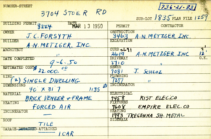 3704 Stoer Road Shaker Heights, OH 44122 PARCEL ID: 736-21-083 Building Permit Date: 03-13-1950 Plan File Number: 1259 scanned, 10194 Microfilm Roll: Roll015, NewRoll#2 Neighborhood: Sussex Owner: Forsyth, J. C. Builder: A. N. Metzger, Inc. Architect: A. N. Metzger, Inc. Estimated Cost: 22000 Date Completed: 09-06-1950 Kind: Single, Single Residence or Dwelling (2) Material: Brick Veneer and Frame Heating: Forced Air Roof: Tile Garage: attached |