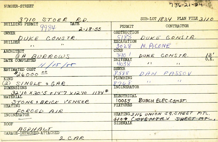 3710 Stoer Road Shaker Heights, OH 44122 PARCEL ID: 736-21-084 Building Permit Date: 02-18-1955 Plan File Number: 3110 Microfilm Roll: Roll#43 Neighborhood: Sussex Owner: Duke Construction Builder: Duke Construction Architect: Burrows, G. H. Estimated Cost: 26000 Date Completed: 11-15-1955 Kind: Single Dwelling and Garage (2) Material: Stone and Brick Veneer Heating: Forced Air Roof: Asphalt Garage: detached 2 car |
