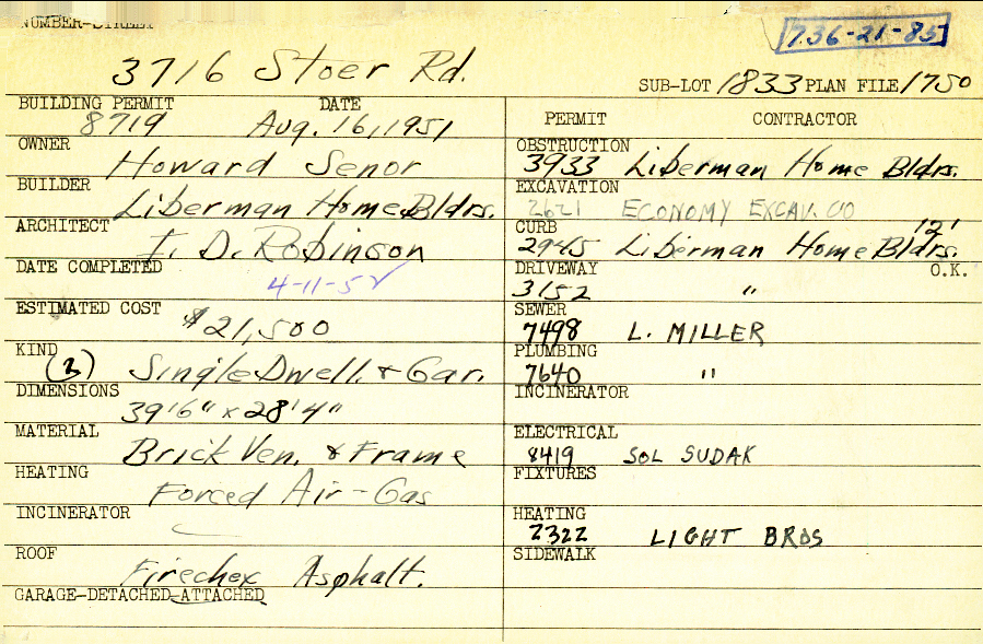 3716 Stoer Road Shaker Heights, OH 44122 PARCEL ID: 736-21-085 Building Permit Date: 08-16-1951 Plan File Number: 1750 scanned, 4865 Microfilm Roll: Roll26A, Roll#66 Neighborhood: Sussex Owner: Senor, Howard Builder: Liberman Home Builders Architect: Robinson, I. D. Estimated Cost: 21500 Date Completed: 04-11-1952 Kind: Single Dwelling and Garage (2) Material: Brick Veneer and Frame Heating: Forced Air - Gas Roof: Asphalt Garage: attached |