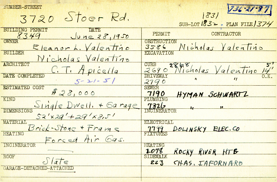 3720 Stoer Road Shaker Heights, OH 44122 PARCEL ID: 736-21-087 Building Permit Date: 06-28-1950 Plan File Number: 1374 all scanned Microfilm Roll: Roll016 Neighborhood: Sussex Owner: Valentino, Eleanor L. Builder: Valentino, Nicholas Architect: Apicella, C. T. Estimated Cost: 28000 Date Completed: 05-21-1951 Kind: Single Dwelling and Garage Material: Brick, Stone and Frame Heating: Forced Air - Gas Roof: Slate Garage: attached |