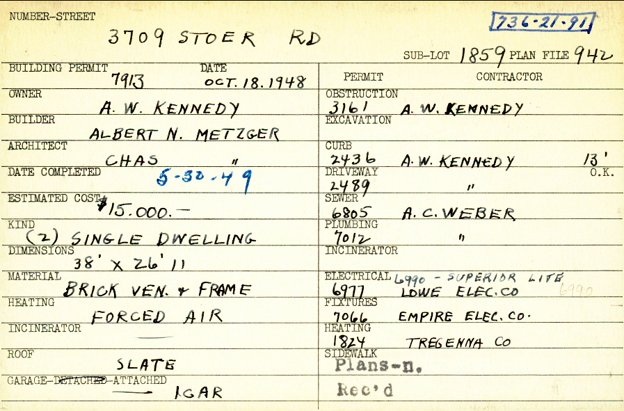 3709 Stoer Road Shaker Heights, OH 44122 PARCEL ID: 736-21-091 Building Permit Date: 10-18-1948 Plan File Number: 942 all scanned Microfilm Roll: Roll012 Neighborhood: Sussex Owner: Kennedy, A. W. Builder: Metzger, Albert N. Architect: Metzger, Charles A. Estimated Cost: 15000 Date Completed: 05-30-1949 Kind: Single, Single Residence or Dwelling (2) Material: Brick Veneer and Frame Heating: Forced Air Roof: Slate Garage: attached |