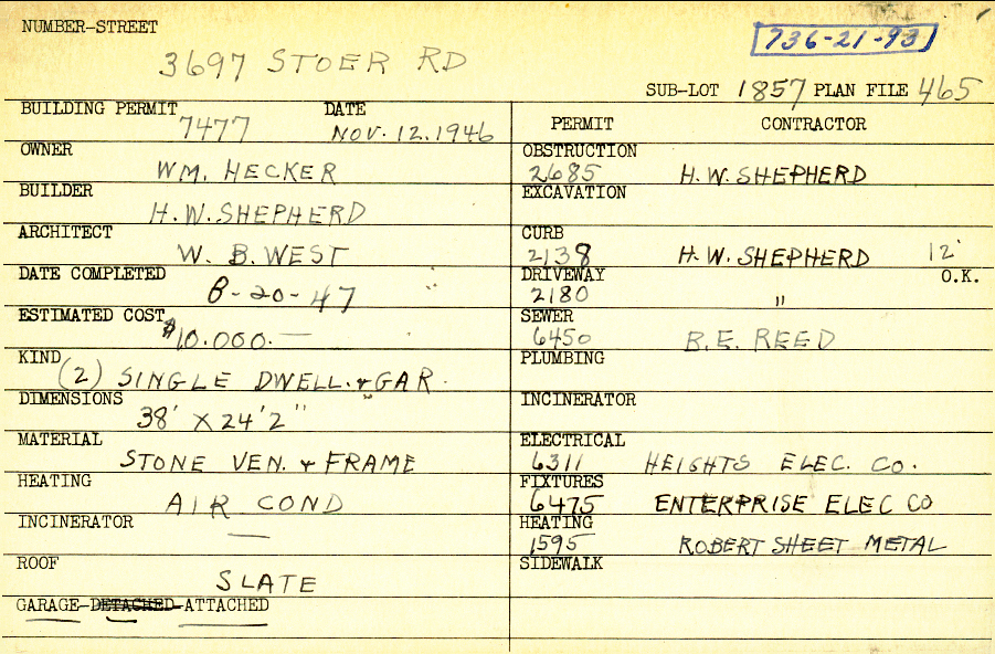 3697 Stoer Road Shaker Heights, OH 44122 PARCEL ID: 736-21-093 Building Permit Date: 11-12-1946 Plan File Number: 465 all scanned Microfilm Roll: Roll004 Neighborhood: Sussex Owner: Hecker, William Builder: Shepherd, H. W. Architect: West, W. B. Estimated Cost: 10000 Date Completed: 08-20-1947 Kind: Single Dwelling and Garage (2) Material: Stone Veneer and Frame Heating: Air Conditioned Roof: Slate Garage: attached |