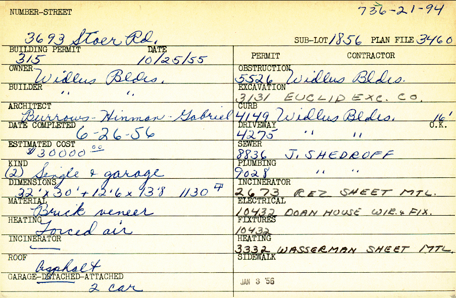 3693 Stoer Road Shaker Heights, OH 44122 PARCEL ID: 736-21-094 Building Permit Date: 10-25-1955 Plan File Number: 789 scanned, 3460 Microfilm Roll: Roll011, Roll#51 Neighborhood: Sussex Owner: Widlus Builders Builder: Widlus Builders Architect: Burrows, Hinman, Gabriel Estimated Cost: 30000 Date Completed: 06-26-1956 Kind: Single Dwelling and Garage (2) Material: Brick Veneer Heating: Forced Air Roof: Asphalt Garage: detached 2 car |