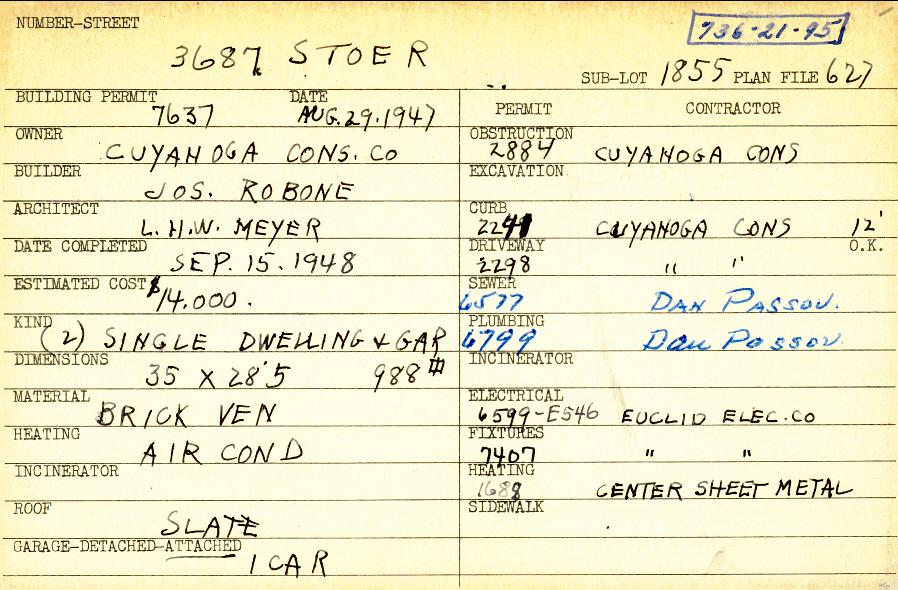 3687 Stoer Road Shaker Heights, OH 44122 PARCEL ID: 736-21-095 Building Permit Date: 08-29-1947 Plan File Number: 627 all scanned Microfilm Roll: Roll008 Neighborhood: Sussex Owner: Cuyahoga Construction Company Builder: Robone, Joseph Architect: Meyer, L. H. W. Estimated Cost: 14000 Date Completed: 09-15-1948 Kind: Single Dwelling and Garage (2) Material: Brick Veneer Heating: Air Conditioned Roof: Slate Garage: attached |