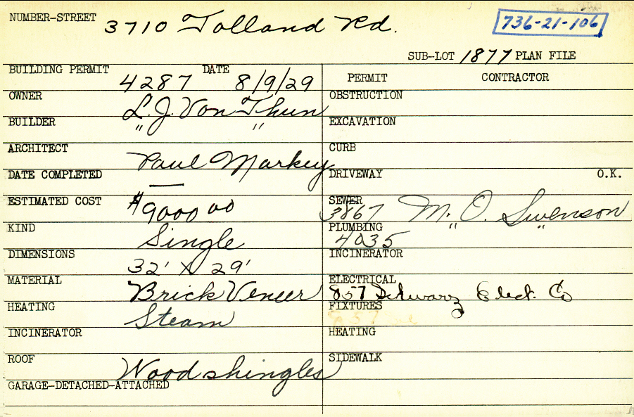 3710 Tolland Road Shaker Heights, OH 44122 PARCEL ID: 736-21-106 Building Permit Date: 08-09-1929 Plan File Number: 0 Neighborhood: Sussex Owner: Von Thun, L. J. Builder: Von Thun, L. J. Architect: Markey, Paul Estimated Cost: 9000 Kind: Single, Single Residence or Dwelling Material: Brick Veneer Heating: Steam Roof: Wood Shingle |