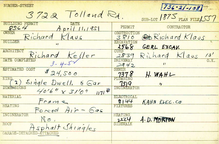 3722 Tolland Road Shaker Heights, OH 44122 PARCEL ID: 736-21-108 Building Permit Date: 04-11-1951 Plan File Number: 1557 scanned, 12101 Microfilm Roll: Roll024, NewRoll#11 Neighborhood: Sussex Owner: Klaus, Richard Builder: Klaus, Richard Architect: Keller, Richard A. Estimated Cost: 24500 Date Completed: 03-04-1952 Kind: Single Dwelling and Garage (2) Material: Frame Heating: Forced Air - Gas Roof: Asphalt Shingles Garage: attached |