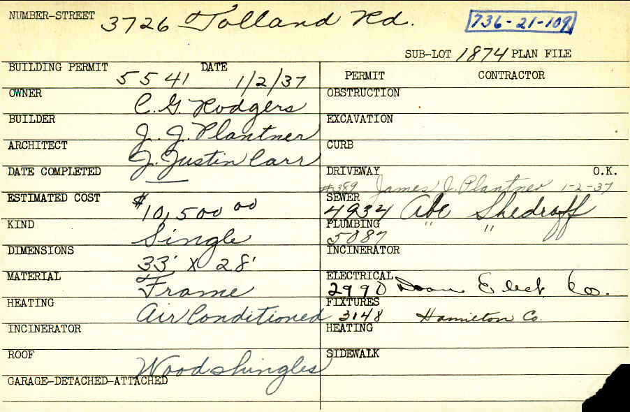3726 Tolland Road Shaker Heights, OH 44122 PARCEL ID: 736-21-109 Building Permit Date: 01-02-1937 Plan File Number: 0 Neighborhood: Sussex Owner: Rodgers, C. G. Builder: Plantner, J. J. Architect: Carr, J. Justin Estimated Cost: 10500 Kind: Single, Single Residence or Dwelling Material: Frame Heating: Air Conditioned Roof: Wood Shingle |