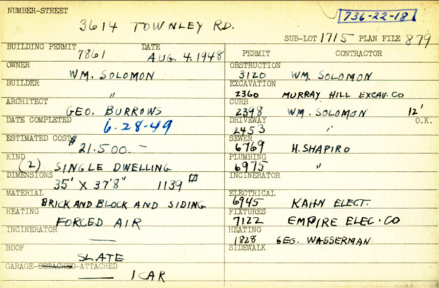 3614 Townley Road Shaker Heights, OH 44122 PARCEL ID: 736-22-018 Building Permit Date: 08-04-1948 Plan File Number: 879 all scanned Microfilm Roll: Roll011 Neighborhood: Sussex Owner: Solomon, William Builder: Solomon, William Architect: Burrows, George Estimated Cost: 21500 Date Completed: 06-28-1949 Kind: Single, Single Residence or Dwelling (2) Material: Brick and Block and Siding Heating: Forced Air Roof: Slate Garage: attached |