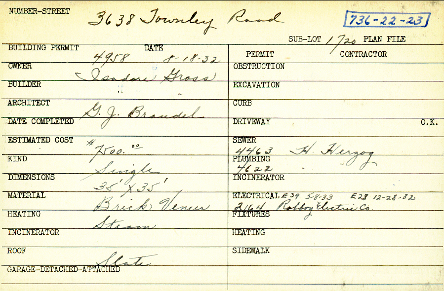 3638 Townley Road Shaker Heights, OH 44122 PARCEL ID: 736-22-023 Building Permit Date: 08-18-1932 Plan File Number: 0 Neighborhood: Sussex Owner: Gross, Isadore Builder: Gross, Isadore Architect: Braudel, G. J. Estimated Cost: 7500 Kind: Single, Single Residence or Dwelling Material: Brick Veneer Heating: Steam Roof: Slate |