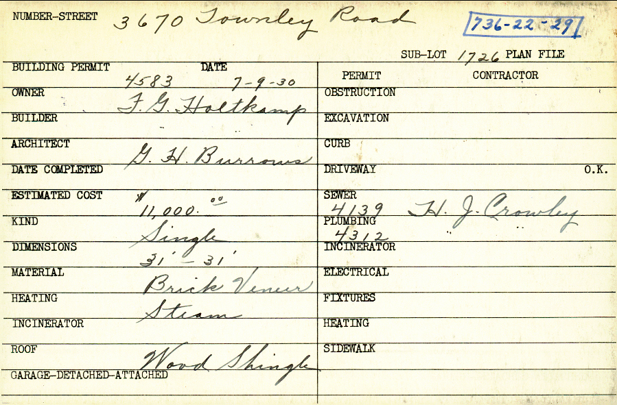 3670 Townley Road Shaker Heights, OH 44122 PARCEL ID: 736-22-029 Building Permit Date: 07-09-1930 Plan File Number: 0 Neighborhood: Sussex Owner: Holtkamp, F. G. Builder: Holtkamp, F. G. Architect: Burrows, G. H. Estimated Cost: 11000 Kind: Single, Single Residence or Dwelling Material: Brick Veneer Heating: Steam Roof: Wood Shingle |