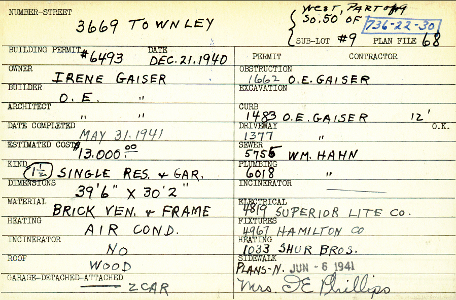 3669 Townley Road Shaker Heights, OH 44122 PARCEL ID: 736-22-030 Building Permit Date: 12-21-1940 Plan File Number: 68, 7332 Microfilm Roll: Roll#92 Neighborhood: Sussex Owner: Gaiser, Irene Builder: Gaiser, O. E. Architect: Gaiser, O. E. Estimated Cost: 13000 Date Completed: 05-31-1941 Kind: Single Dwelling and Garage Material: Brick Veneer and Frame Heating: Air Conditioned Roof: Wood Garage: attached 2 car |