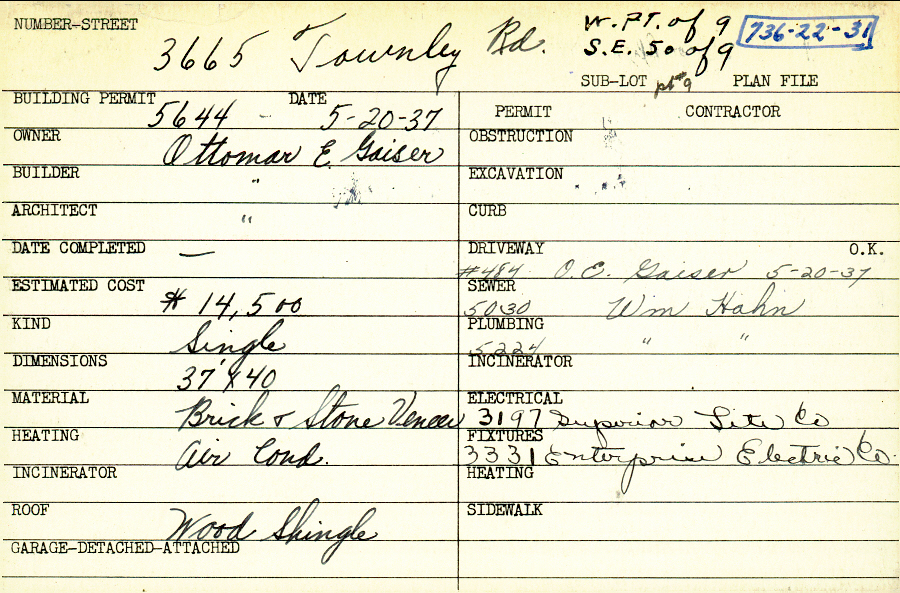 3665 Townley Road Shaker Heights, OH 44122 PARCEL ID: 736-22-031 Building Permit Date: 05-20-1937 Plan File Number: 0 Neighborhood: Sussex Owner: Gaiser, Ottomar E. Builder: Gaiser, Ottomar E. Architect: Gaiser, Ottomar E. Estimated Cost: 14500 Kind: Single, Single Residence or Dwelling Material: Brick and Stone Veneer Heating: Air Conditioned Roof: Wood Shingle Card Available: yes |