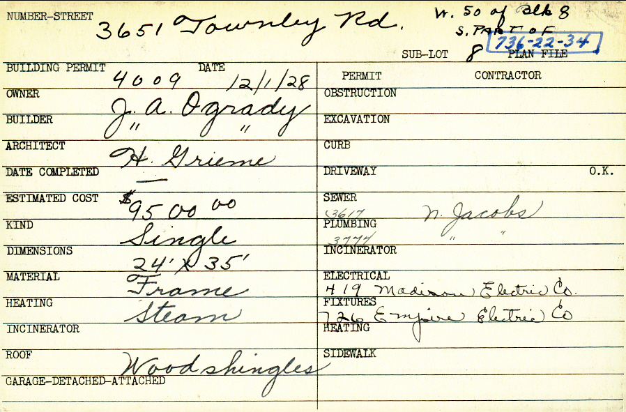 3651 Townley Road Shaker Heights, OH 44122 PARCEL ID: 736-22-034 Building Permit Date: 12-01-1928 Plan File Number: 0 Neighborhood: Sussex Owner: Ogrady, J. A. Builder: Ogrady, J. A. Architect: Grieme, H. Estimated Cost: 9500 Kind: Single, Single Residence or Dwelling Material: Frame Heating: Steam Roof: Wood Shingle |