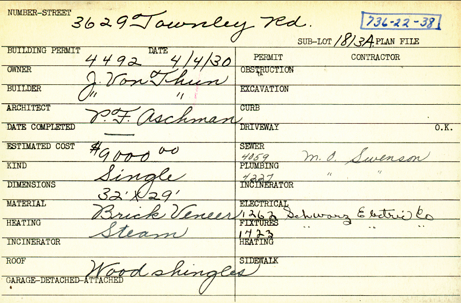 3629 Townley Road Shaker Heights, OH 44122 PARCEL ID: 736-22-038 Building Permit Date: 04-04-1930 Plan File Number: 7172 Microfilm Roll: Roll#91 Neighborhood: Sussex Owner: Von Thun, J. Builder: Von Thun, J. Architect: Aschman, Paul F. Estimated Cost: 9000 Kind: Single, Single Residence or Dwelling Material: Brick Veneer Heating: Steam Roof: Wood Shingle |