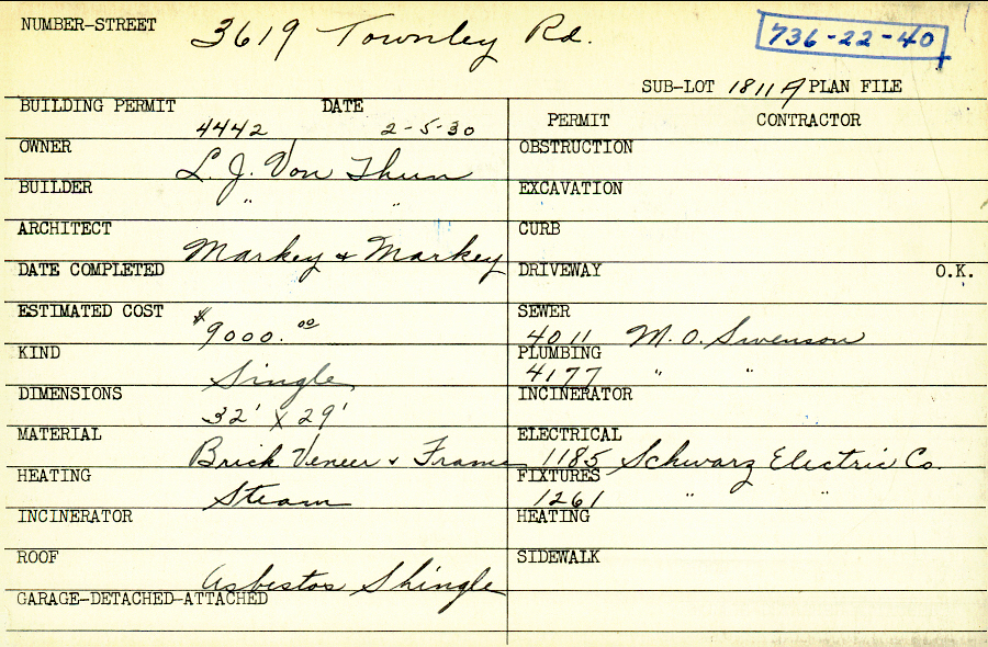 3619 Townley Road Shaker Heights, OH 44122 PARCEL ID: 736-22-040 Building Permit Date: 02-05-1930 Plan File Number: 0 Neighborhood: Sussex Owner: Von Thun, L. J. Builder: Von Thun, L. J. Architect: Markey and Markey Estimated Cost: 9000 Kind: Single, Single Residence or Dwelling Material: Brick Veneer and Frame Heating: Steam Roof: Asbestos Shingles Card Available: yes |
