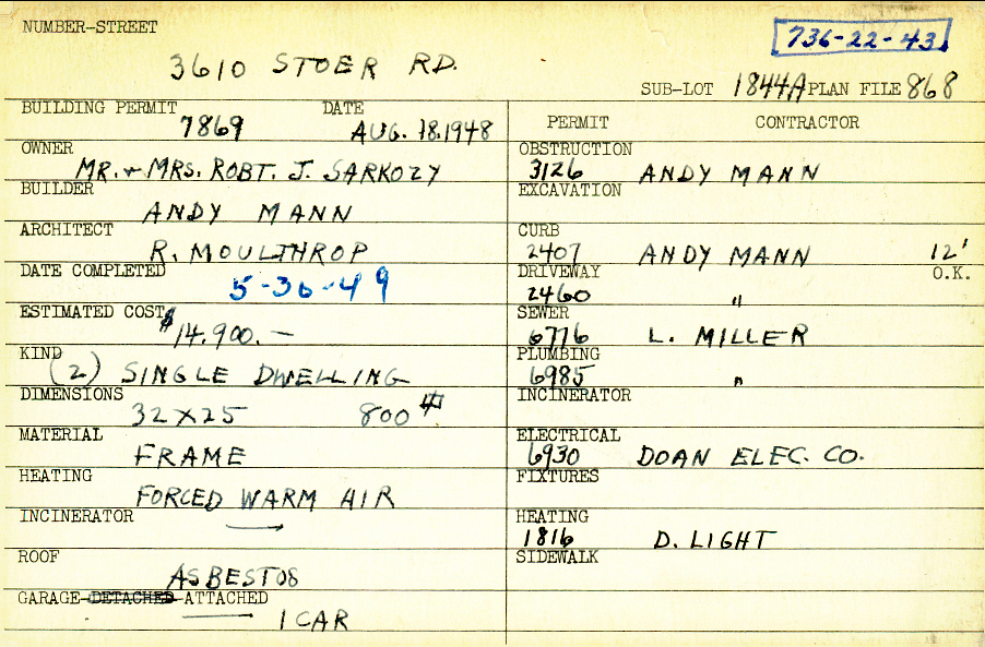3610 Stoer Road Shaker Heights, OH 44122 PARCEL ID: 736-22-043 Building Permit Date: 08-18-1948 Plan File Number: 868 scanned, 3562, 4395 Microfilm Roll: Roll011, Roll#52, Roll#63 Neighborhood: Sussex Owner: Sarkozy, Mr. and Mrs. Robert J. Builder: Mann, Andy Architect: Moulthrop, R. Estimated Cost: 14900 Date Completed: 05-30-1949 Kind: Single, Single Residence or Dwelling (2) Material: Frame Heating: Forced Air Roof: Asbestos Garage: attached |