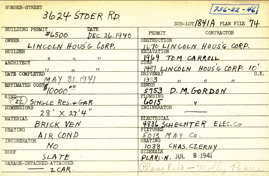 3624 Stoer Road Shaker Heights, OH 44122 PARCEL ID: 736-22-046 Building Permit Date: 12-26-1940 Plan File Number: 74 Neighborhood: Sussex Owner: Lincoln Housing Corporation Builder: Lincoln Housing Corporation Architect: Lincoln Housing Corporation Estimated Cost: 10000 Date Completed: 05-31-1941 Kind: Single 2-1/2 Material: Brick Veneer Heating: Air Conditioned Roof: Slate Garage: detached 2 car |