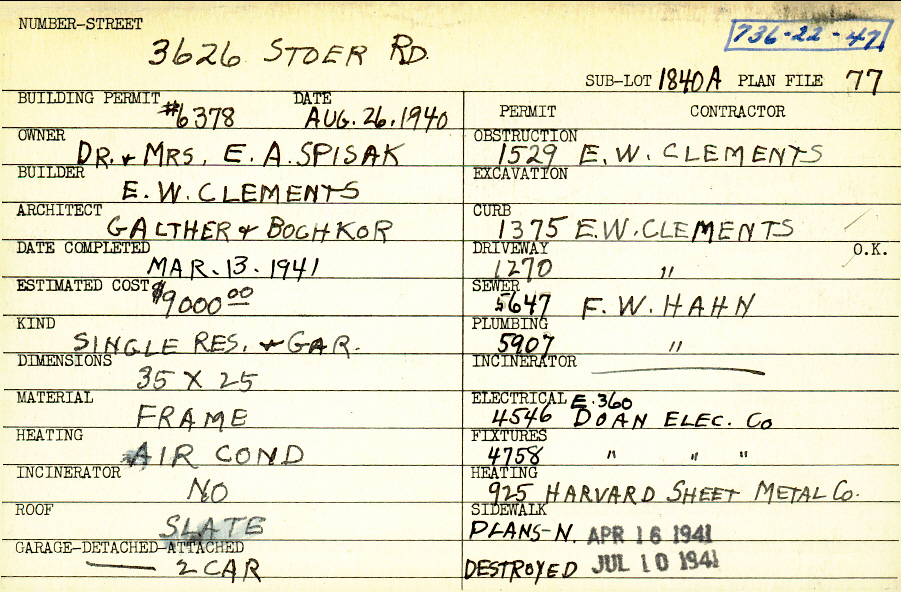 3626 Stoer Road Shaker Heights, OH 44122 PARCEL ID: 736-22-047 Building Permit Date: 08-26-1940 Plan File Number: 77, 5945 Microfilm Roll: Roll#80 Neighborhood: Sussex Owner: Spisak, Dr. and Mrs. E. A. Builder: Clements, E. W. Architect: Galther and Bochkor Estimated Cost: 9000 Date Completed: 03-13-1941 Kind: Single Dwelling and Garage Material: Frame Heating: Air Conditioned Roof: Slate Garage: detached 2 car |