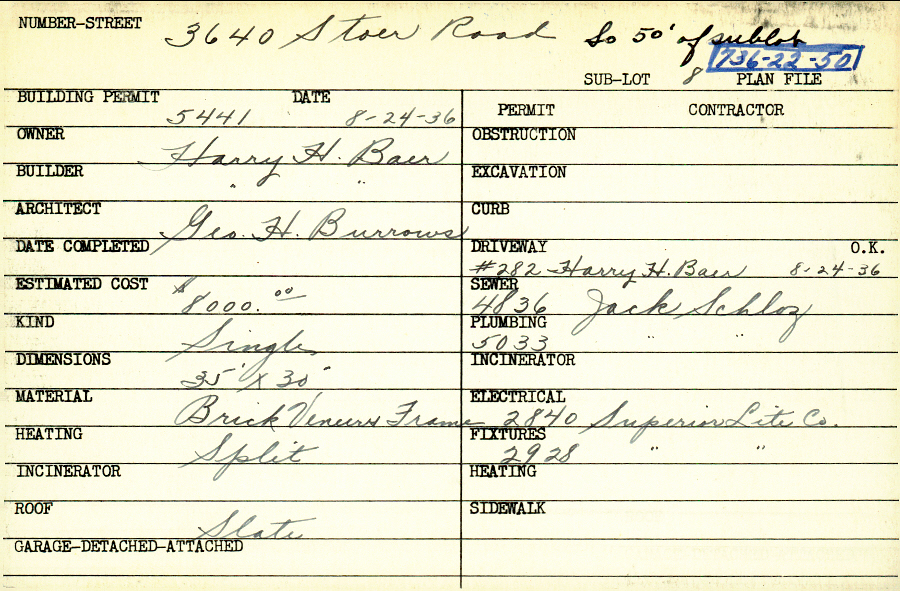 3640 Stoer Road Shaker Heights, OH 44122 PARCEL ID: 736-22-050 Building Permit Date: 08-24-1936 Plan File Number: 3037 Microfilm Roll: Roll#43 Neighborhood: Sussex Owner: Baer, Harry H. Builder: Baer, Harry H. Architect: Burrows, George H. Estimated Cost: 8000 Kind: Single, Single Residence or Dwelling Material: Brick Veneer and Frame Roof: Slate |