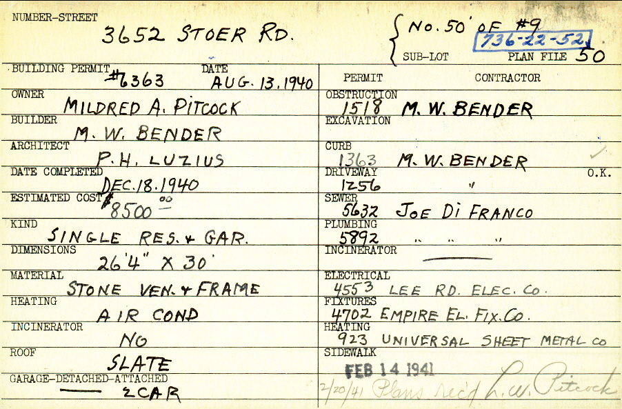 3652 Stoer Road Shaker Heights, OH 44122 PARCEL ID: 736-22-052 Building Permit Date: 08-13-1940 Plan File Number: 50 Neighborhood: Sussex Owner: Pitcock, Mildred A. Builder: Bender, M. W. Architect: Luzius, P. H. Estimated Cost: 8500 Date Completed: 12-18-1940 Kind: Single Dwelling and Garage Material: Stone Veneer and Frame Heating: Air Conditioned Roof: Slate Garage: detached 2 car Card Available: yes |