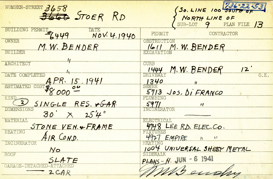 3658 Stoer Road Shaker Heights, OH 44122 PARCEL ID: 736-22-053 Building Permit Date: 11-04-1940 Plan File Number: 13 Neighborhood: Sussex Owner: Bender, M. W. Builder: Bender, M. W. Architect: Bender, M. W. Estimated Cost: 8000 Date Completed: 04-15-1941 Kind: Single Dwelling and Garage (2) Material: Stone Veneer and Frame Heating: Air Conditioned Roof: Slate Garage: detached 2 car Card Available: yes |