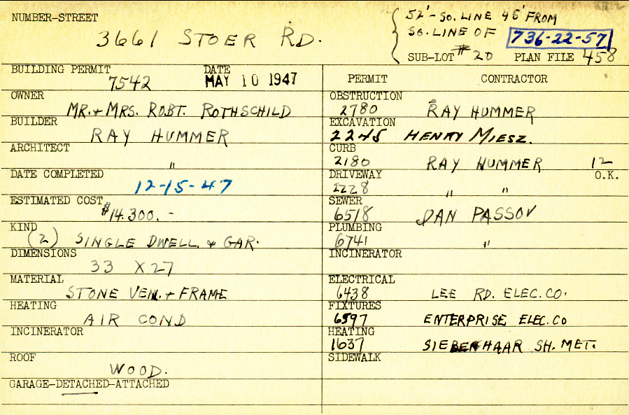 3661 Stoer Road Shaker Heights, OH 44122 PARCEL ID: 736-22-057 Building Permit Date: 05-10-1947 Plan File Number: 458 all scanned Microfilm Roll: Roll004 Neighborhood: Sussex Owner: Rothschild, Mr. and Mrs. Robert Builder: Hummer, Ray Architect: Hummer, Ray Estimated Cost: 14300 Date Completed: 12-15-1947 Kind: Single Dwelling and Garage (2) Material: Stone Veneer and Frame Heating: Air Conditioned Roof: Wood Garage: detached |