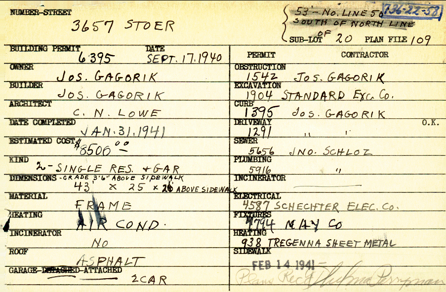 3657 Stoer Road Shaker Heights, OH 44122 PARCEL ID: 736-22-058 Building Permit Date: 09-17-1940 Plan File Number: 109, 6074 Microfilm Roll: Roll#81 Neighborhood: Sussex Owner: Gagorik, Joseph Builder: Gagorik, Joseph Architect: Lowe, C. N. Estimated Cost: 8500 Date Completed: 01-31-1941 Kind: Single Dwelling and Garage (2) Material: Frame Heating: Air Conditioned Roof: Asphalt Garage: attached 2 car |
