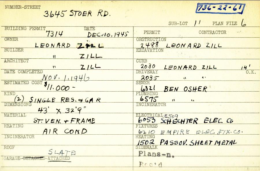 3645 Stoer Road Shaker Heights, OH 44122 PARCEL ID: 736-22-061 Building Permit Date: 12-10-1945 Plan File Number: 6 all scanned Microfilm Roll: Roll001 Neighborhood: Sussex Owner: Zill, Leonard Builder: Zill, Leonard Architect: Zill, Leonard Estimated Cost: 11000 Date Completed: 11-01-1946 Kind: Single Dwelling and Garage (2) Material: Stone Veneer and Frame Heating: Air Conditioned Roof: Slate Garage: attached |