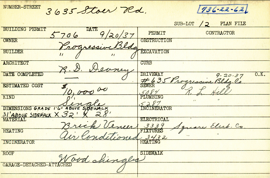 3635 Stoer Road Shaker Heights, OH 44122 PARCEL ID: 736-22-062 Building Permit Date: 09-20-1937 Plan File Number: 0 Neighborhood: Sussex Owner: Progressive Building Builder: Progressive Building Architect: Devney, R. D. Estimated Cost: 10000 Kind: Single, Single Residence or Dwelling Material: Brick Veneer Heating: Air Conditioned Roof: Wood Shingle Card Available: Yes |