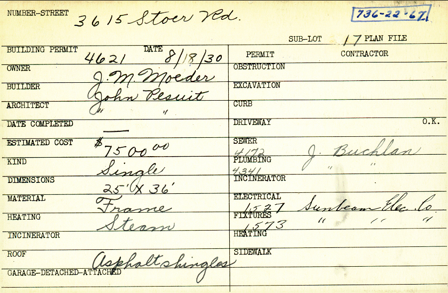3615 Stoer Road Shaker Heights, OH 44122 PARCEL ID: 736-22-067 Building Permit Date: 08-18-1930 Plan File Number: 0 Neighborhood: Sussex Owner: Moeder, J. M. Builder: Pesuit, John Architect: Pesuit, John Estimated Cost: 7500 Kind: Single, Single Residence or Dwelling Material: Frame Heating: Steam Roof: Asphalt Shingles Card Available: yes |