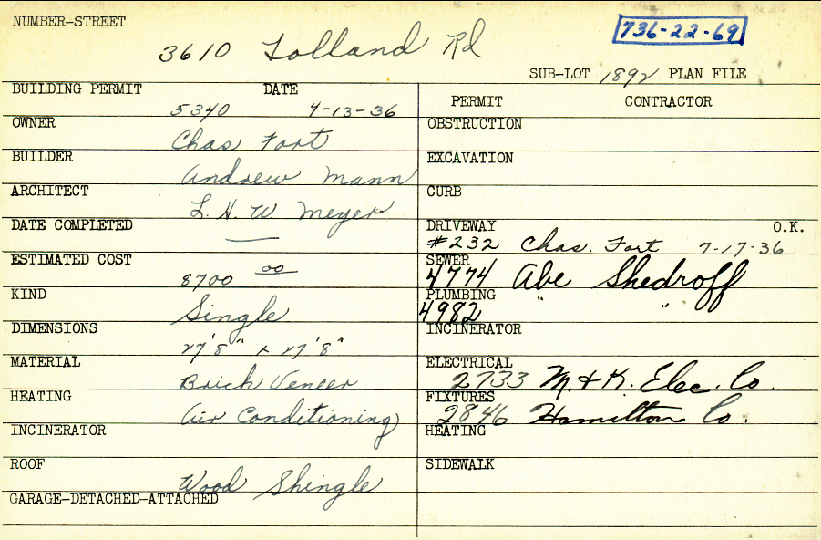 3610 Tolland Road Shaker Heights, OH 44122 PARCEL ID: 736-22-069 Building Permit Date: 04-13-1936 Plan File Number: 0 Neighborhood: Sussex Owner: Fort, Charles Builder: Mann, Andrew Architect: Meyer, L. H. W. Estimated Cost: 8700 Kind: Single, Single Residence or Dwelling Material: Brick Veneer Heating: Air Conditioned Roof: Wood Shingle |