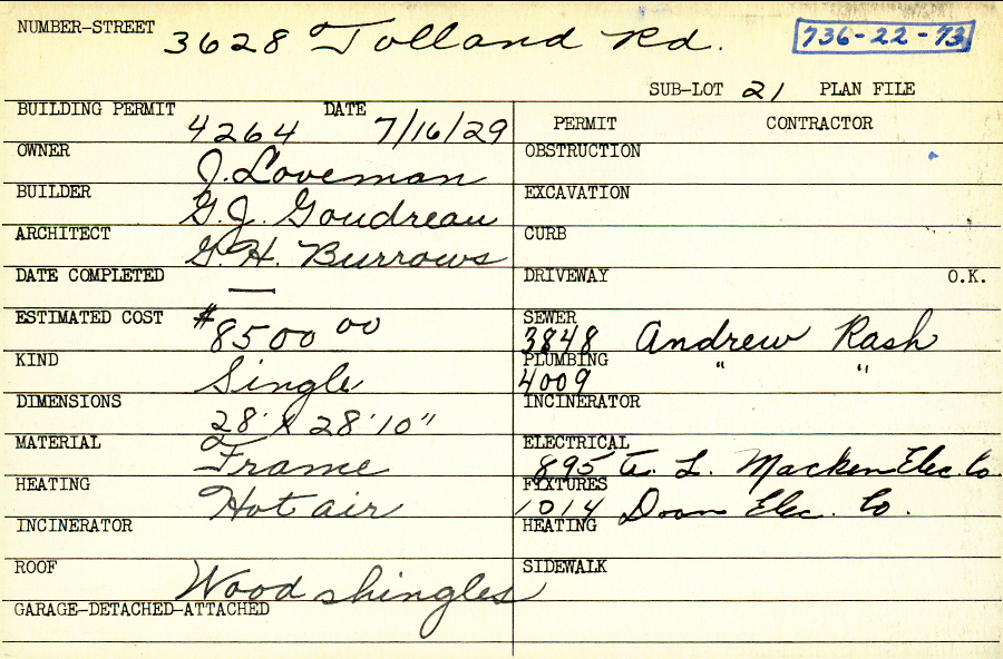 3628 Tolland Road Shaker Heights, OH 44122 PARCEL ID: 736-22-073 Building Permit Date: 07-16-1929 Plan File Number: 0 Neighborhood: Sussex Owner: Loveman, J. Builder: Goudreau, G. J. Architect: Burrows, G. H. Estimated Cost: 8500 Kind: Single, Single Residence or Dwelling Material: Frame Heating: Hot Air Roof: Wood Shingle |